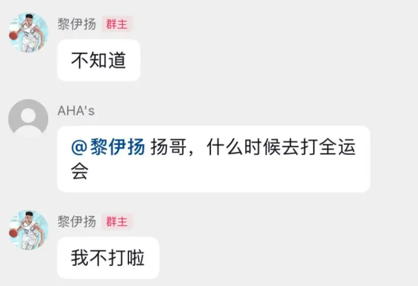 广东队“三张”落选不意外,但这几位还是有些许机会能参加后面的比赛(假如后续需要轮换或者有球员出现伤病),而来自福建男篮的黎伊扬的落选,则可能是真的来不了了,有球迷在论坛评论区晒出了一张和黎伊扬交流的截图,问黎伊扬什么时候打全运会,黎伊扬回复:“我不打啦”,言外之意,要么是广东后卫线人手充足,要么就是福建男篮不放人。