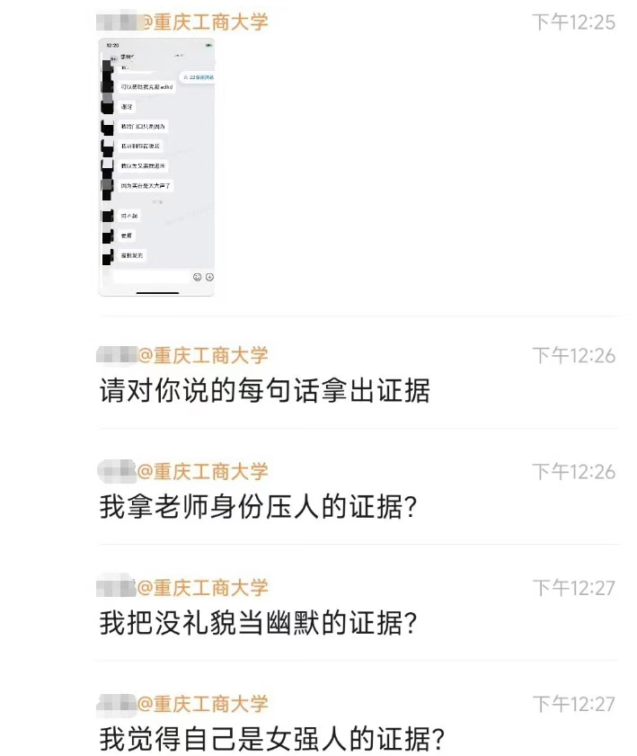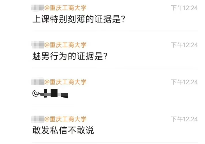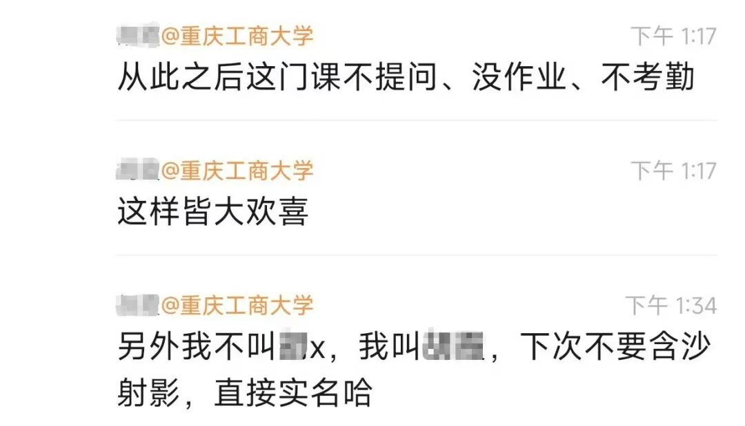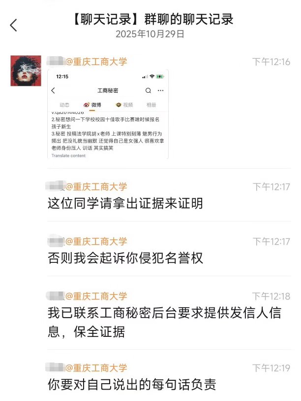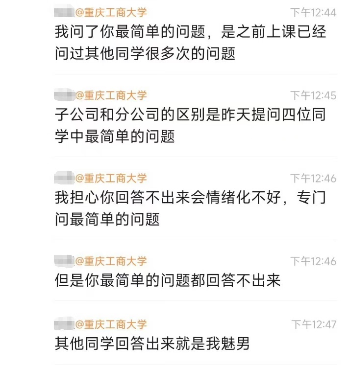 10月29日,重庆工商大学校园账号“工商秘密”上出现一则匿名帖子,矛头指向该校一位胡姓教师,称其“上课特别刻薄、媚男行为频出、把没礼貌当幽默”。