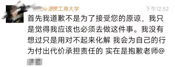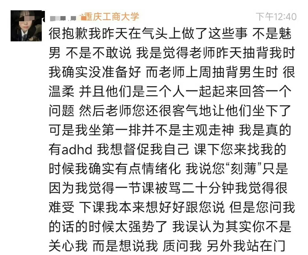 随后,涉事老师在微信群里发出该帖文,并回应:这位同学请拿出证据来证明,否则我会起诉你侵犯名誉权,我已联系后台要求提供发信人信息,保全证据。30日,女生公开道歉:很抱歉在气头上做了这件事,老师抽背我时我确实没准备好,而老师抽背男生时很温柔。抱歉老师我的情绪化让您失望了,向老师和各位同学道歉。