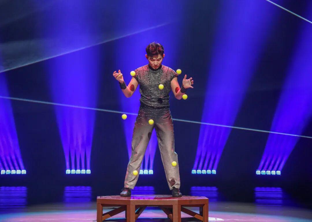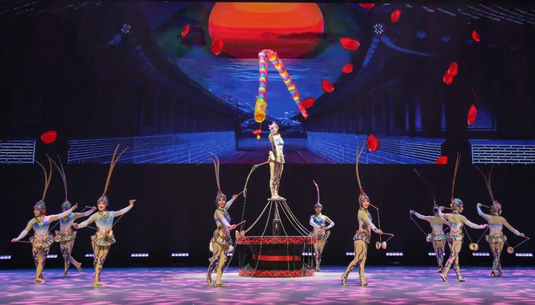 演出在令人目不暇接的《坛三彩》中拉开帷幕,该节目在继承黄河流域民间传统“耍坛子”把戏的同时,加入诸多新开发的技术技巧,高潮迭起、精彩纷呈。《流光弧影⸺手球》《俑•顶碗》同样展现了“人器合一”的独特魅力,前者不断增加手中球的数量,全面展现演员的控球技巧和身体协调能力,呈现出行云流水、千变万化又井然有序的精彩场面;后者结合传统杂技倒立顶碗的技巧,演员们心意相通、配合精妙,塑造出生动鲜活的文物陶俑形象。《山之魂⸺高椅》集杂技顶功难度于一体,将传统椅子顶模式进行形式和内容的创造性变革,增强了平衡技巧的惊险和美感,刚与柔完美结合。